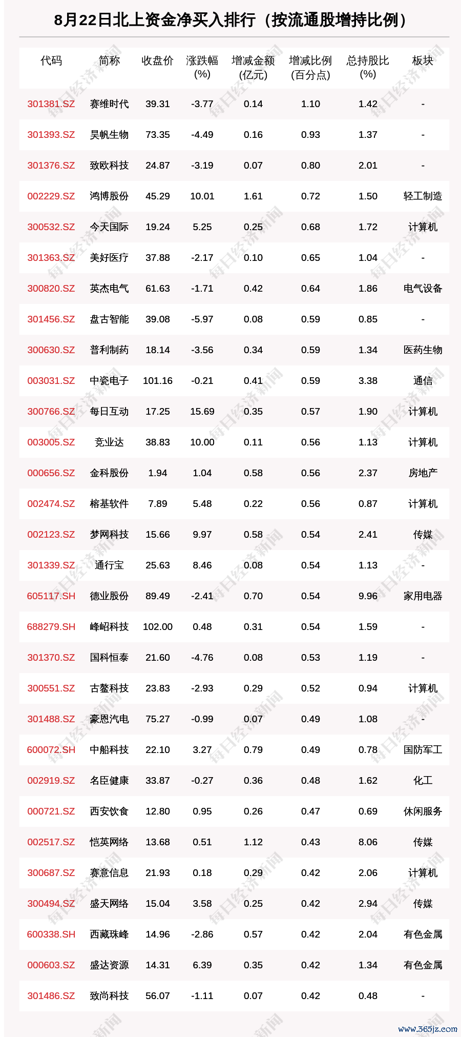 每经AI快讯,8月22日,北上资金净买入的个股共有1,153只,北上资金加仓比例超1%的有978只。其中,赛维时代(301381.SZ,收盘价:39.31元)加仓比例最为明显,最新持股比例1.42%,环比增加1.10个百分点。其他北上资金加仓比例较多的个股还包括昊帆生物(301393.SZ配资在线,收盘价:73.35元)、致欧科技(301376.SZ,收盘价:24.87元)、鸿博股份(002229.SZ,收盘价:45.29元)。