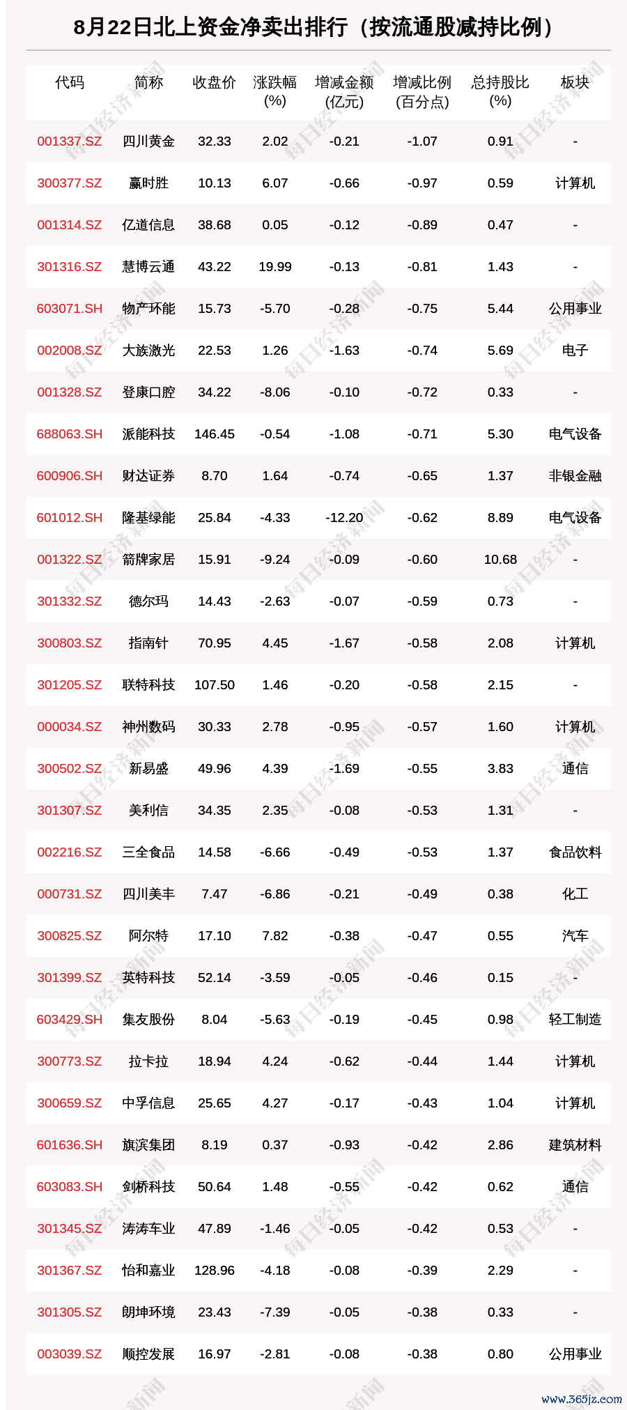 8月22日,北上资金净卖出的个股共有1,362只,北上资金减仓比例超1%的有1,128只。其中,四川黄金(001337.SZ,收盘价:32.33元)减仓比例最为明显,最新持股比例0.91%,环比减少1.07个百分点。其他北上资金减仓比例较多的个股还包括赢时胜(300377.SZ,收盘价:10.13元)、亿道信息(001314.SZ,收盘价:38.68元)、慧博云通(301316.SZ,收盘价:43.22元)。