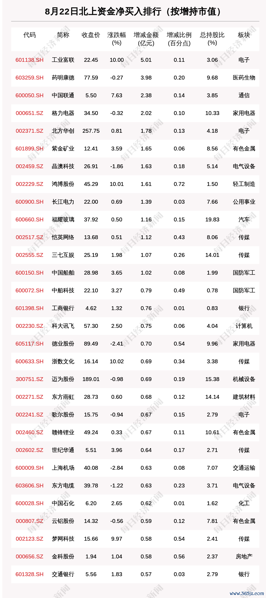 8月22日,按照北向资金增持市值排序,工业富联(601138.SH,收盘价:22.45元)增持市值最大,增持市值5.014亿元,环比增加4.20%。其他北上资金增持市值较多的个股还包括药明康德(603259.SH,收盘价:77.59元)、中国联通(600050.SH,收盘价:5.50元)、格力电器(000651.SZ,收盘价:34.50元)。