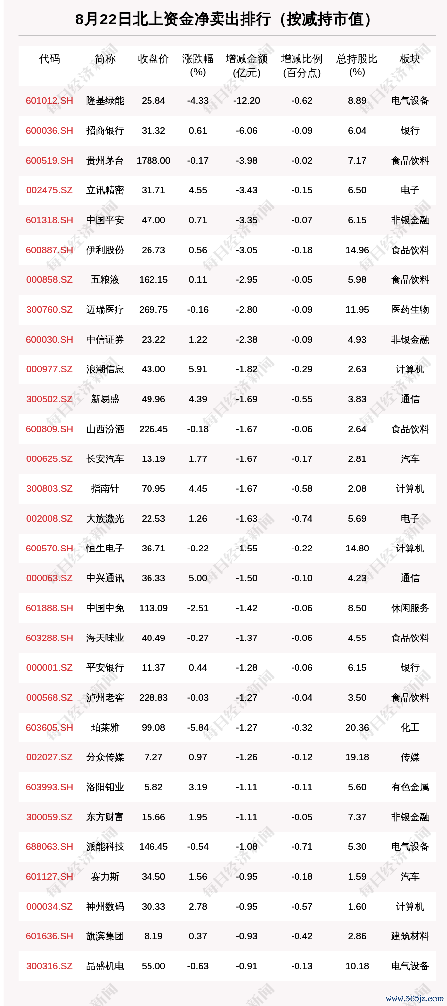 8月22日,按照北向资金减持市值排序,隆基绿能(601012.SH,收盘价:25.84元)减持市值最大,减持市值12.205亿元,环比减少6.27%。其他北上资金减持市值较多的个股还包括招商银行(600036.SH,收盘价:31.32元)、贵州茅台(600519.SH,收盘价:1788.00元)、立讯精密(002475.SZ,收盘价:31.71元)。